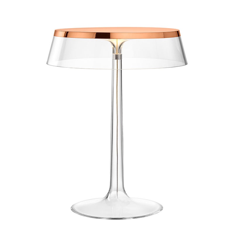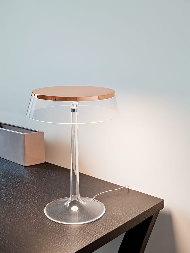 Pieza de diseño con acabado en color cobre. Base y difusor de PMMA transparente moldeado por inyección. Fuente luminosa con tecnología Edge Lighting. Cable elétrico con una longitud útil de 200 cm, con interruptor para regular la intensidad, que garantiza las funciones de encendido y apagado (ON/OFF) y la regulación del flujo luminoso 10-100 %. Suministro elétrico en clavija con enchufes intercambiables.Características técnicas