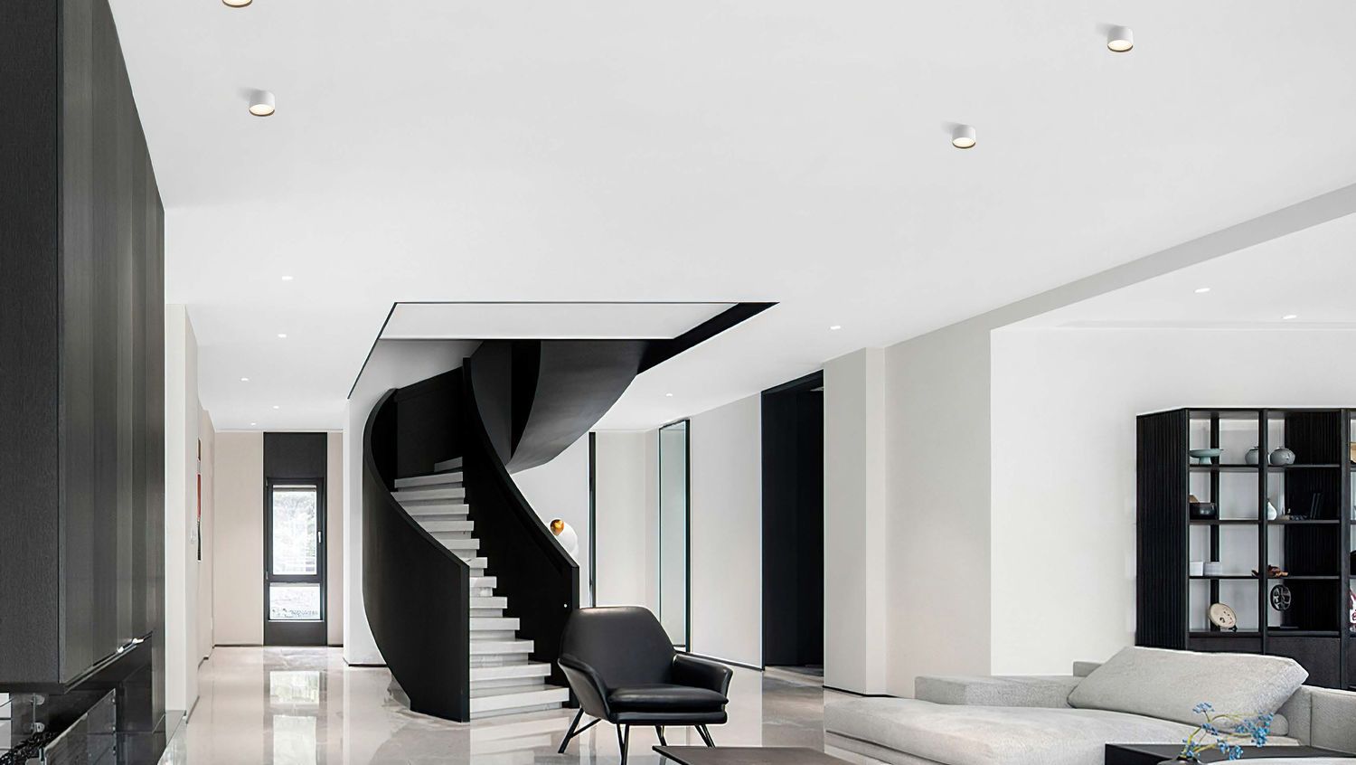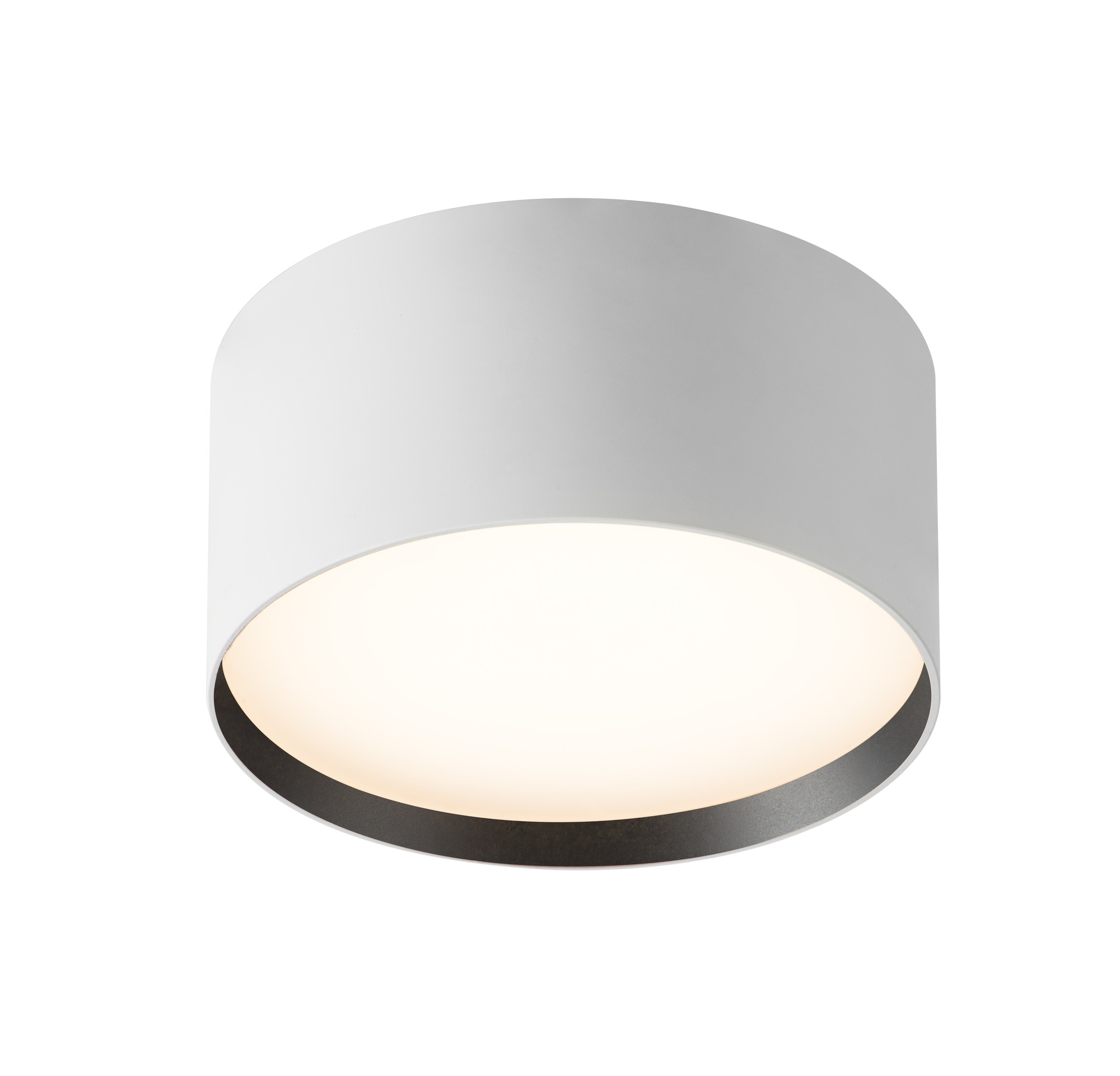 Luminaria de adosar a techo con estructura de aluminio de acabado en blanco y en el interior en negro.