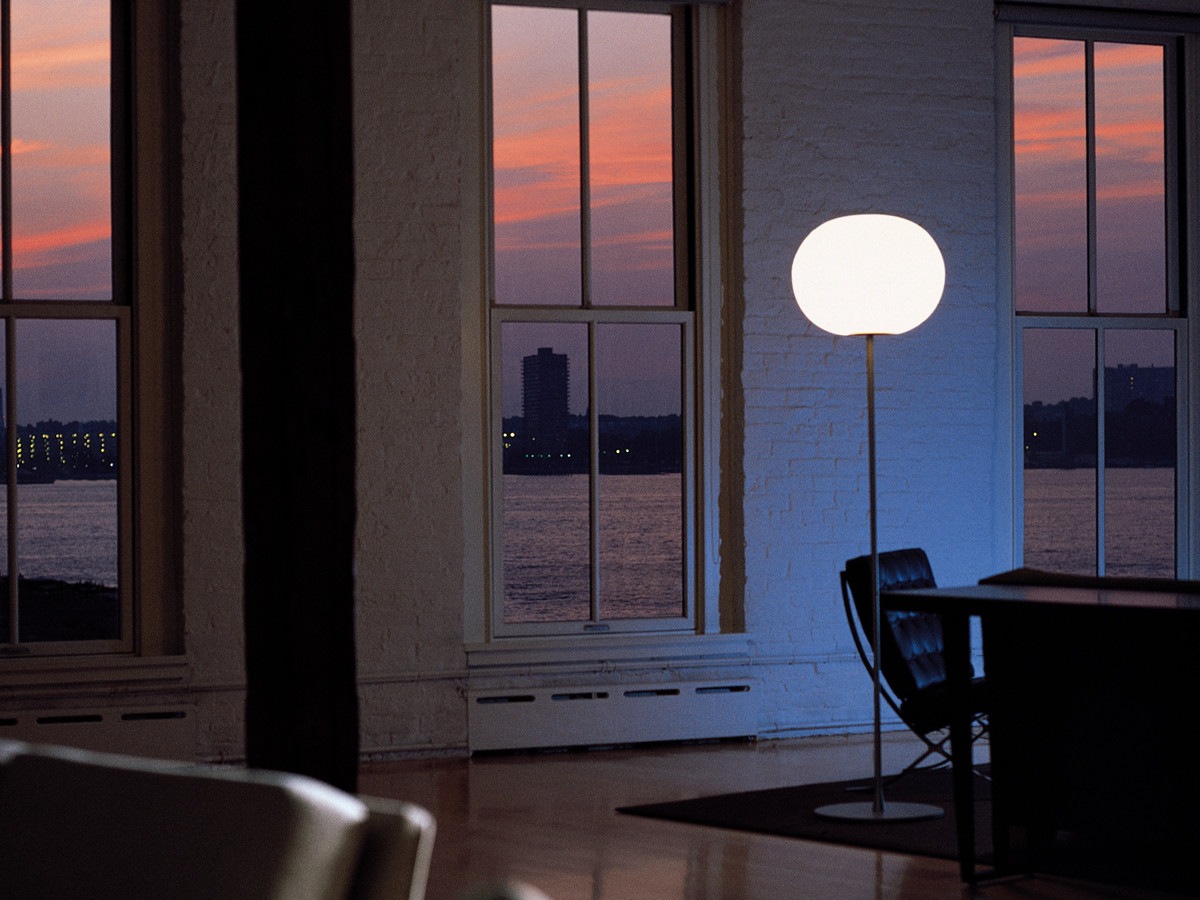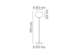 Lámpara de pie de luz difusa. Difusor compuesto por un cristal soplado opalino tratado al ácido y una virola con rosca en aleación de aluminio fundición a presión, con acabado galvánico cromado. Base en acero de gran espesor, pie en tubo de acero y soporte del difusor en aleación de aluminio fundido a presión, todos ellos pintados en color gris. El dimmer electrónico que está en el cable consiente la regulación gradual de la intensidad luminosa.