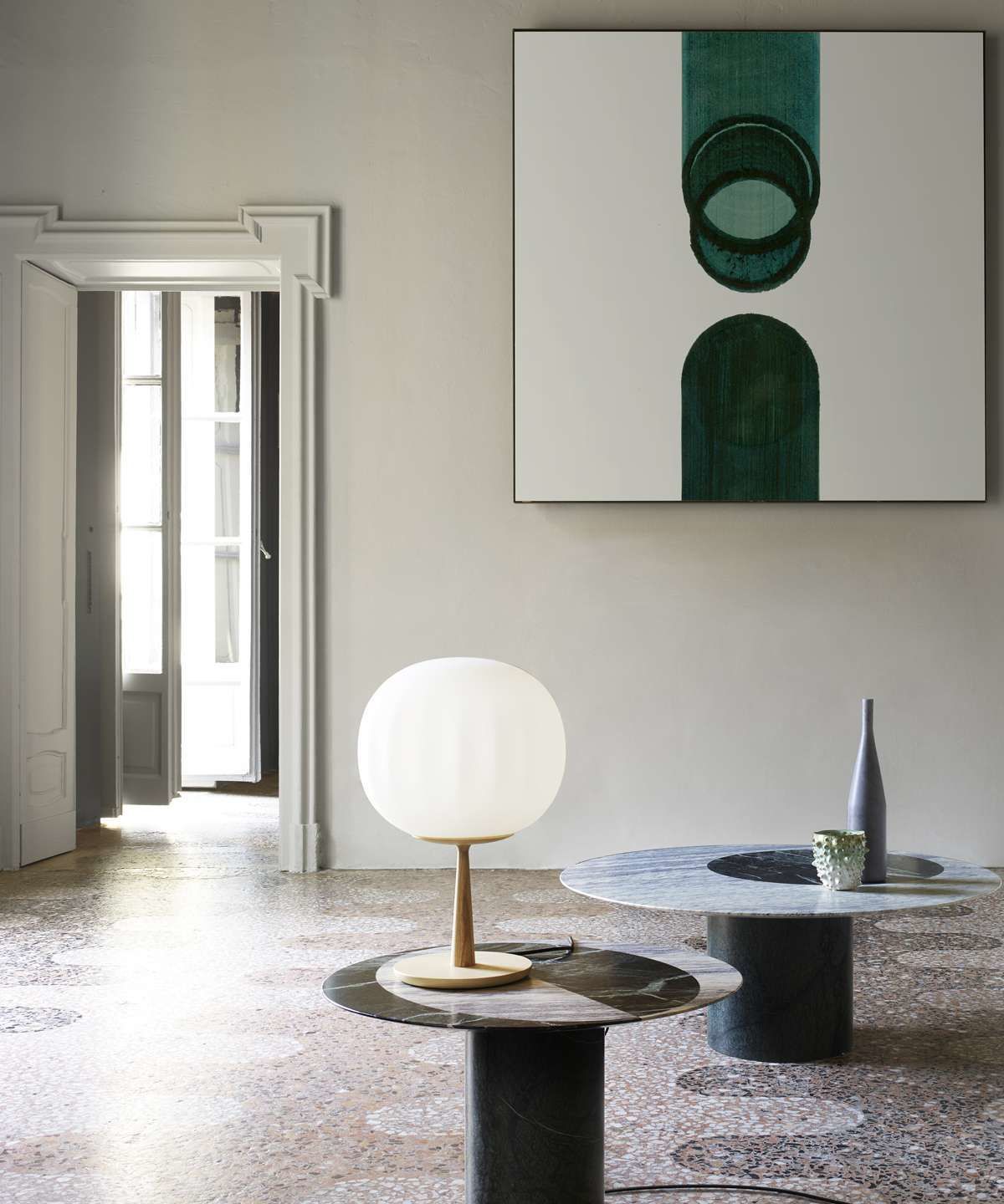Lámpara de mesa Lita en diseño elegante e intemporal con pantalla de vidrio opalina.