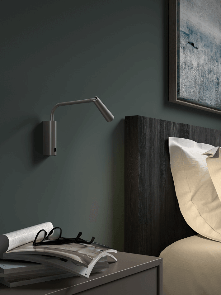 Aplique de pared orientable, con estructura de aluminio y acabado en negro, para facilitar la luz de lectura.