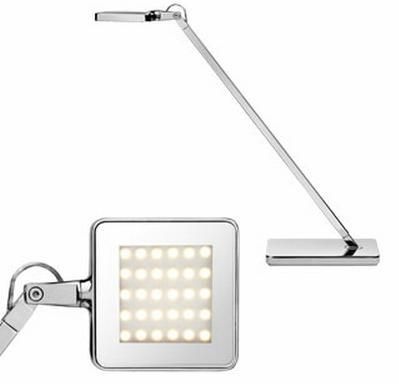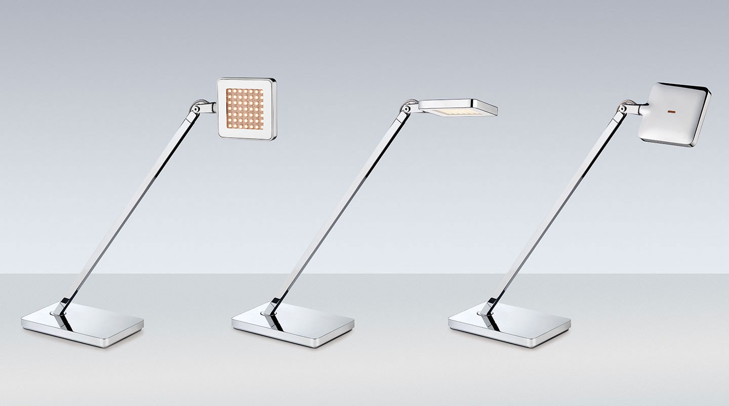Lámpara de sobremesa. Cabezal de aluminio fundido a presión con acabado en color cromo, difusor en metacrilato fotograbado con borde aluminizado. Alimentador con clavija, base en zamak fundido a presión. Cabezal orientable. Interruptor ON/OFF con tecnología Soft Touch y regulación del flujo luminoso de doble intensidad (100% -50%- 0%). Alimentador con clavija con varios plug intercambiables.