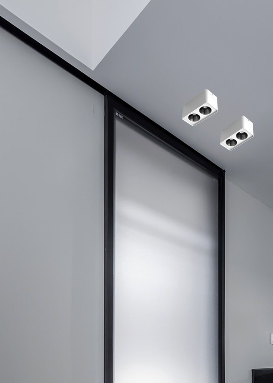 Luminaria de adosar con estructura de aluminio y acabado en color blanco y reflectores en color negro. Driver integrado. Regulación ON-OFF.