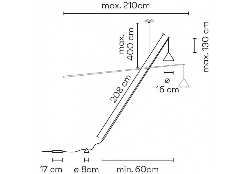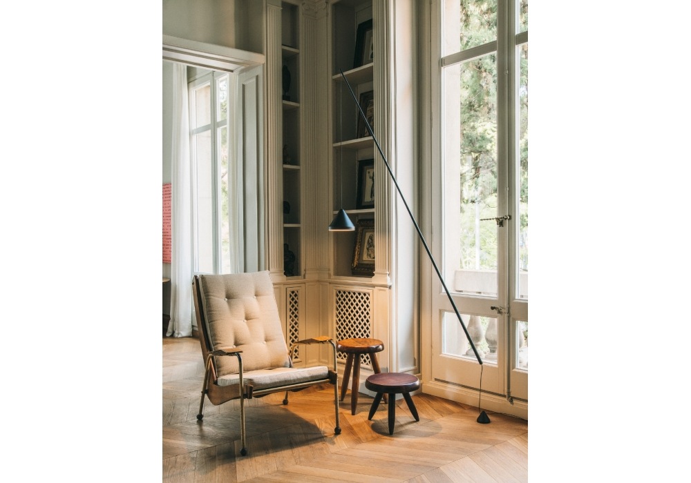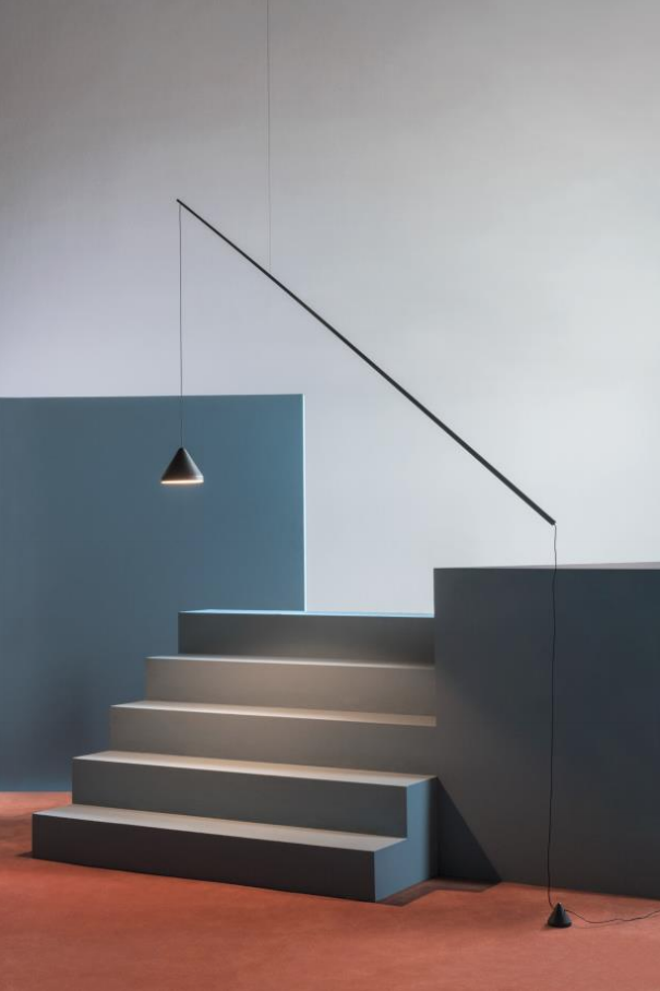 Vibia presenta una luminaria de pie. Suspendida del techo mediante un cable de acero prácticamente invisible, la luminaria está equipada con un contrapeso en el suelo que guía el cable elétrico y permite colocar la tija y la pantalla de aluminio en el emplazamiento deseado.