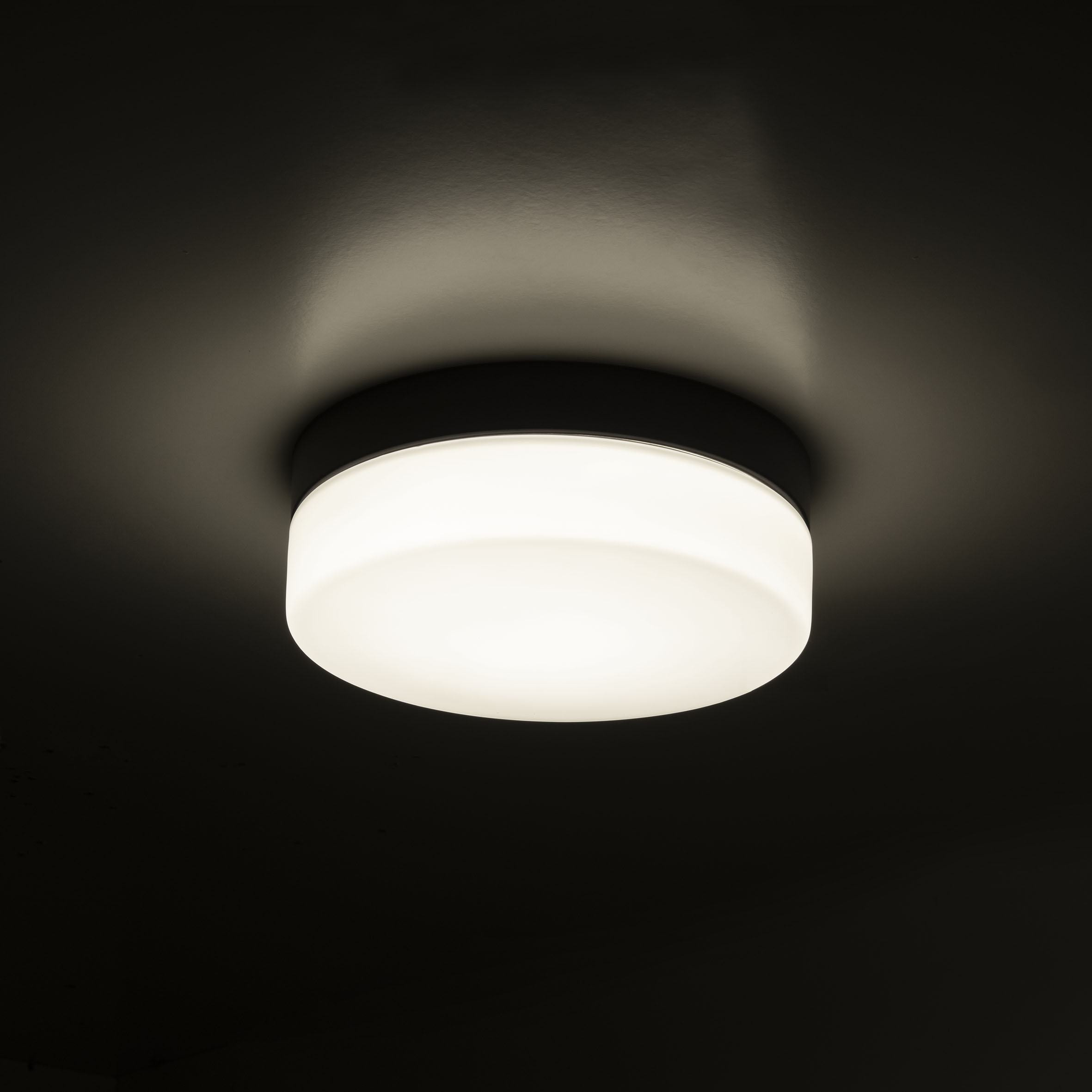 Plafón con estructura de acero y acabado en color negro. El material del difusor es en cristal opal.