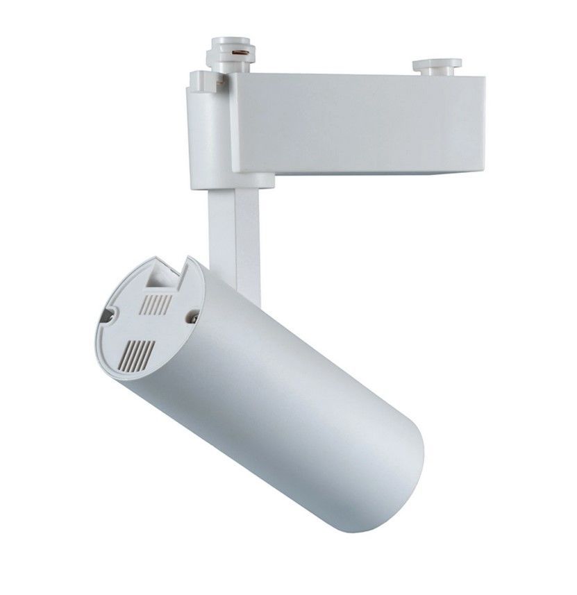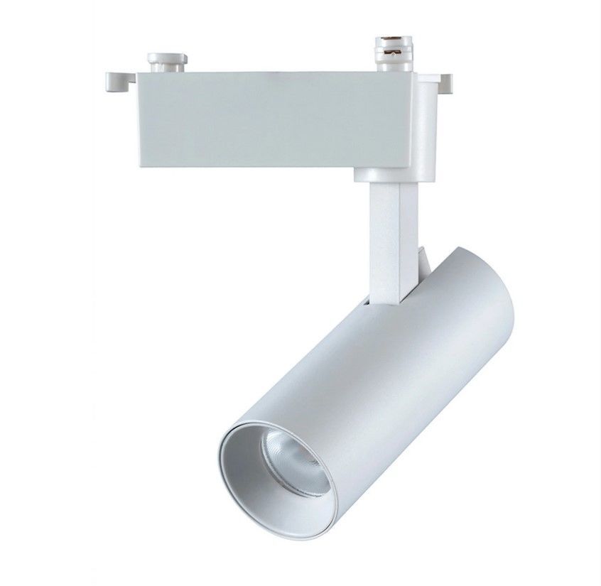 Proyector móvil para riel NTR326 con cuerpo cilíndrico en fundición de aluminio en color blanco, conexionado con un driver electrónico de alimentación 220-240V alojado dentro del spot, para sistema LED integrado de 30W de consumo (2700LM), 36° de apertura del haz de luz, en tonalidad cálida (3000K). Base rectangular.