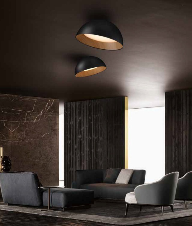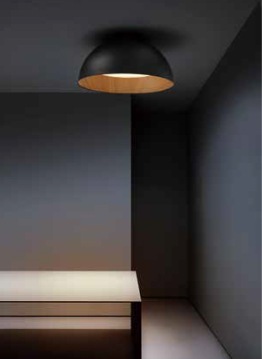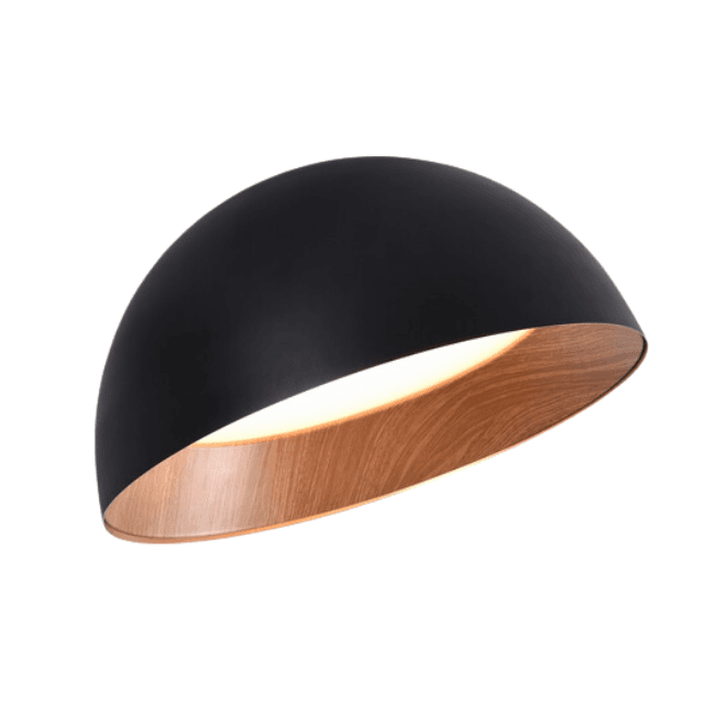 Luminaria de adosar a techo con estructura de aluminio y acabado en color negro en el exterior y madera en el interior.