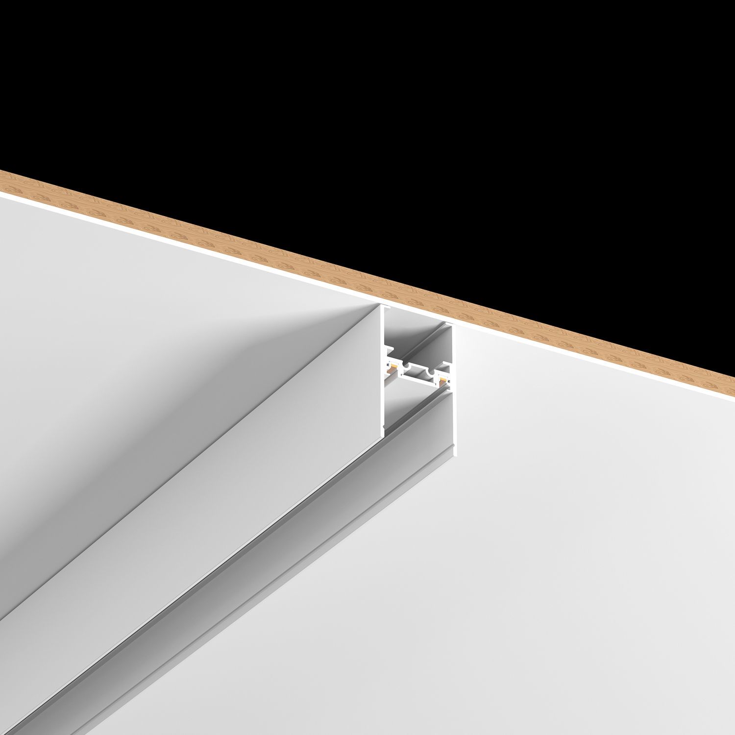 Riel magnético, de adosar a techo, con estructura en aluminio y acabado en color blanco.