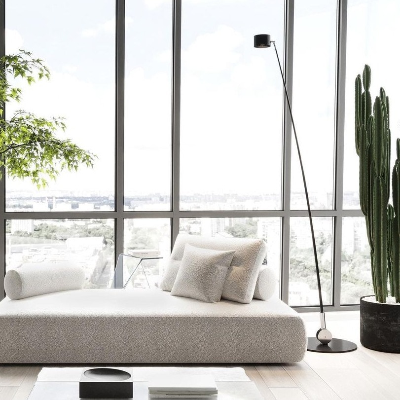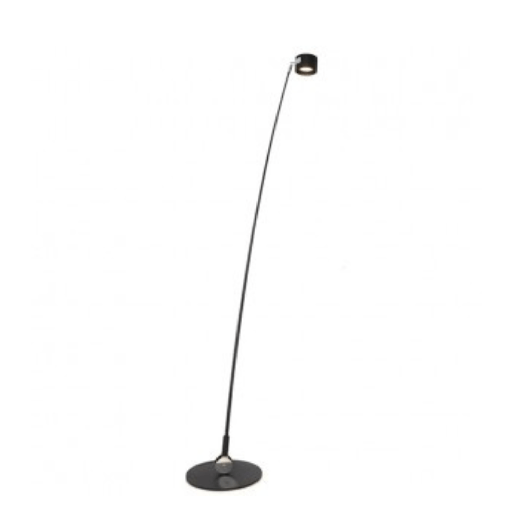 Luminaria de pie con estructura de fibra de vidrio y metal y acabado en color negro.