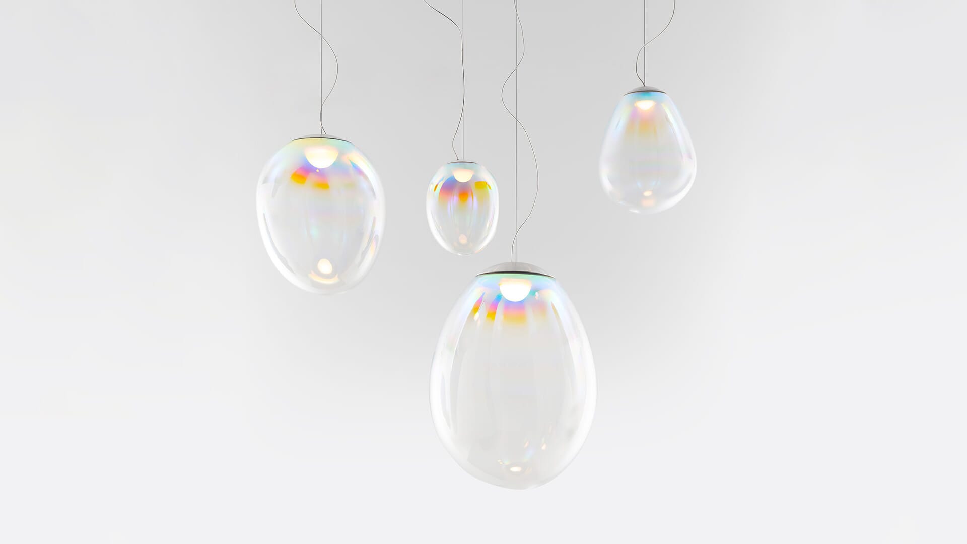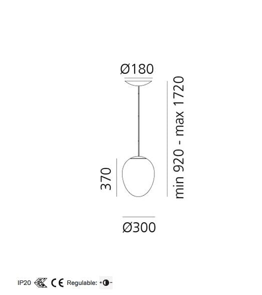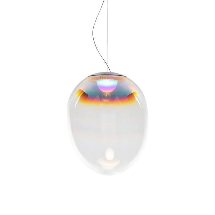 Material: Montaje de techo en chapa de acero galvanizado, rosetón de cubierta en aluminio pulido a espejo, cable de suspensión de acero. Cuerpo de la lámpara en aleación de aluminio fundido, cubierta estética en aluminio pulido a espejo. Difusor de vidrio soplado a boca (artesanalmente) con tratamiento dicróico PVD, soporte interno para la fijación del difusor en tecnopolímero reforzado con fibra de vidrio moldeado por inyección.
