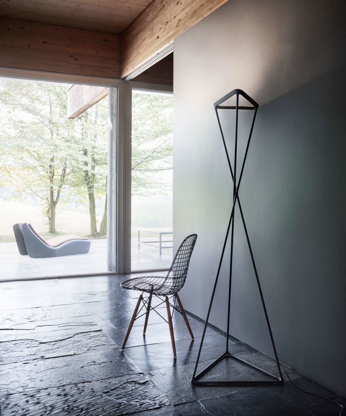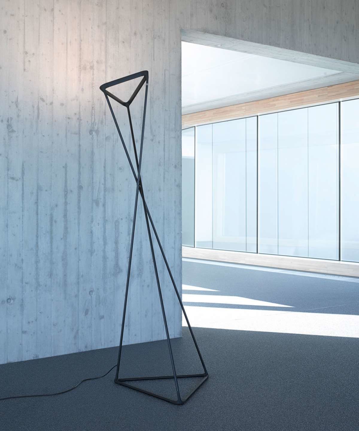 Gracias a su movilidad, la lámpara de pie de Luceplan dibuja un cono de luz claro que se proyecta en pared y el techo proporcionando una iluminación indirecta ideal, por ejemplo, para una sala de espera o living.