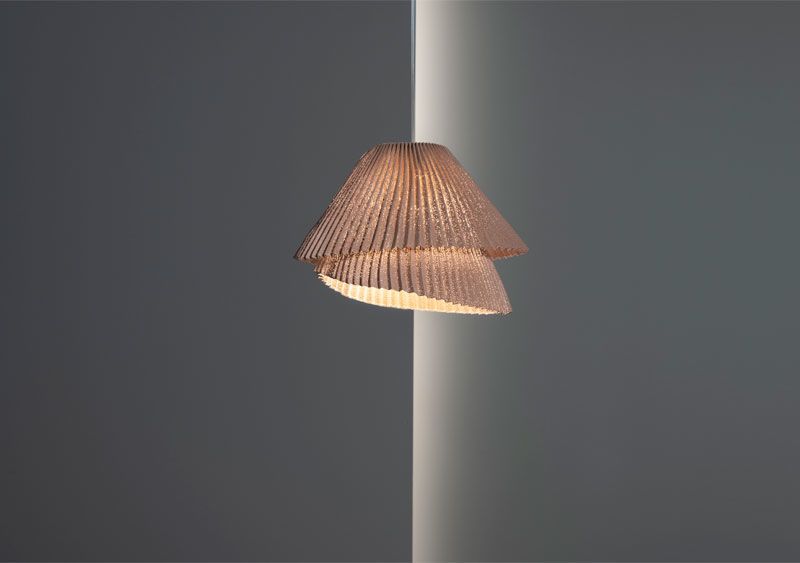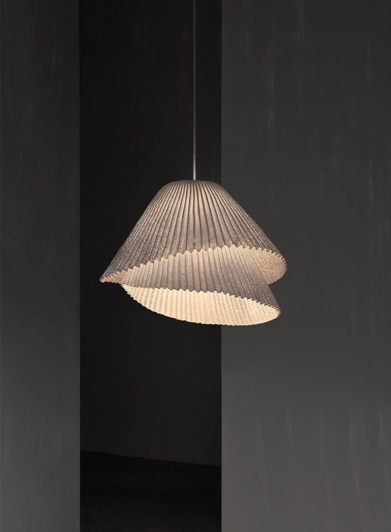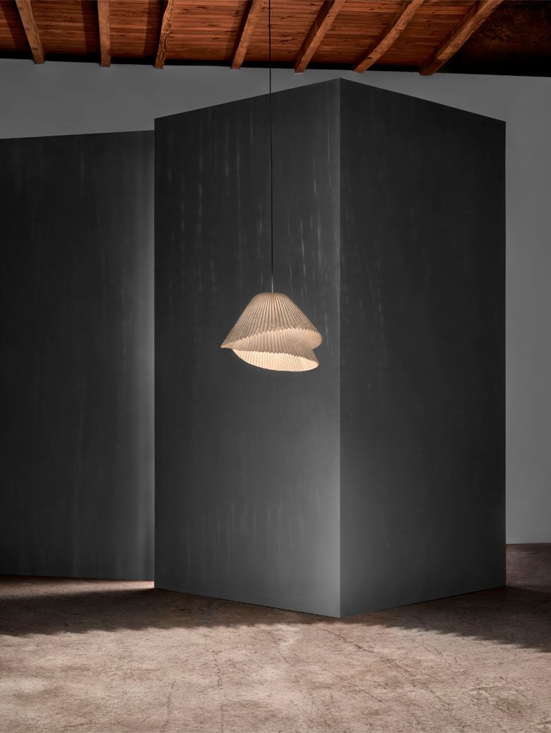 Tempo es una colección trabajada en finos pliegues, da forma a dos capas que se superponen creando dos modelos de luminarias llenas de dinamismo. Dos formas vivas que irradian luz por sus poros con delicadeza. La representación de dos instantes generados por un mismo movimiento con diferente tempo.