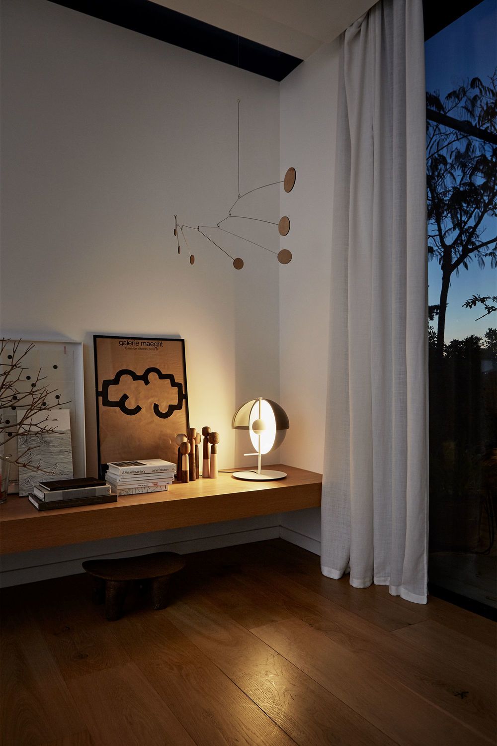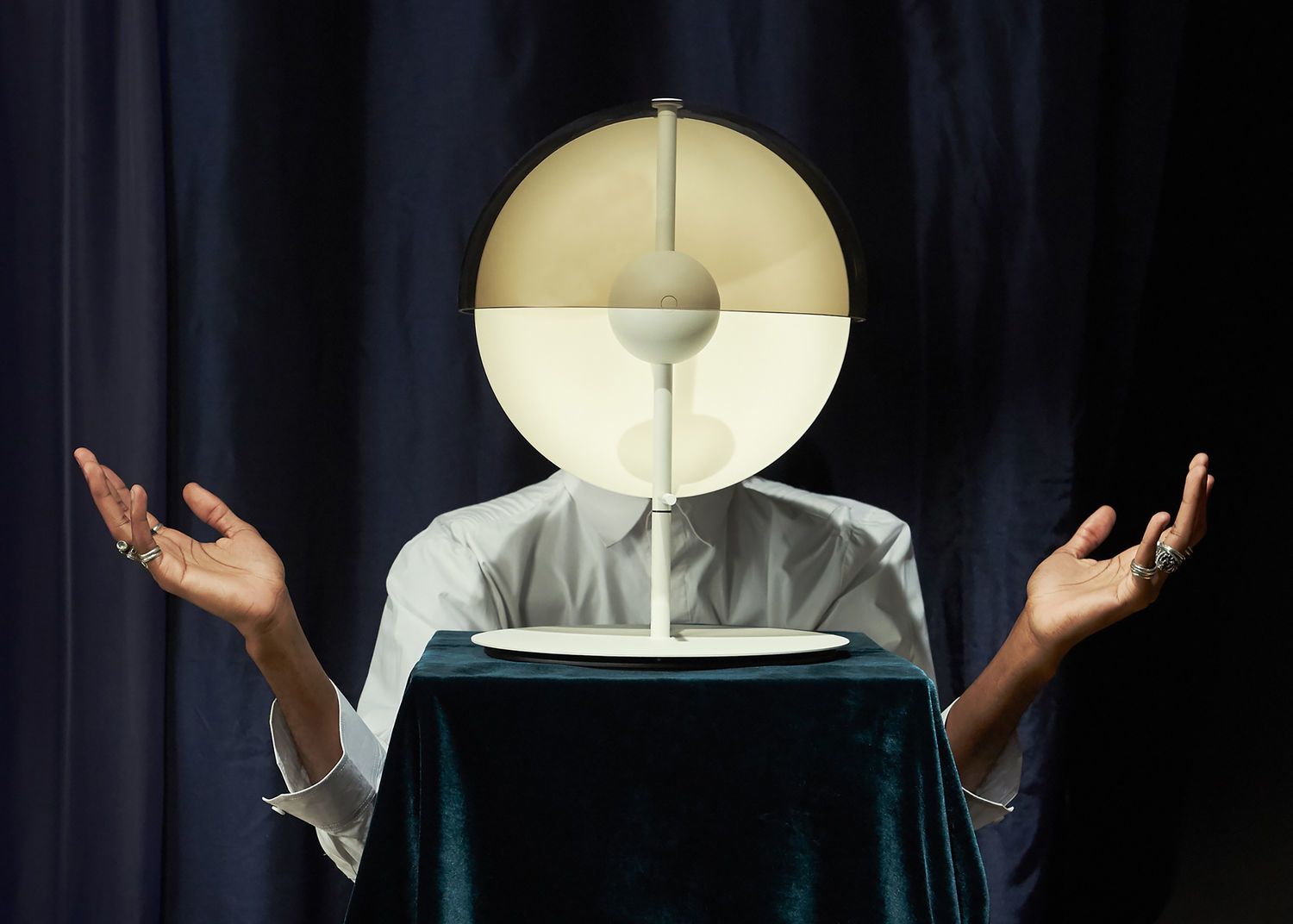 Theia tiene dos caras, para descubrirlas sólo hay que girarla suavemente sobre su eje. Se puede dirigir hacia el usuario y funciona como una lámpara para leer. O bien, hacia un objeto o una pared, creando un sutil efecto de luz indirecta que aporta calidez. Este giro cambia completamente la percepción de la pieza, ya que su difusor metálico es totalmente opaco.
