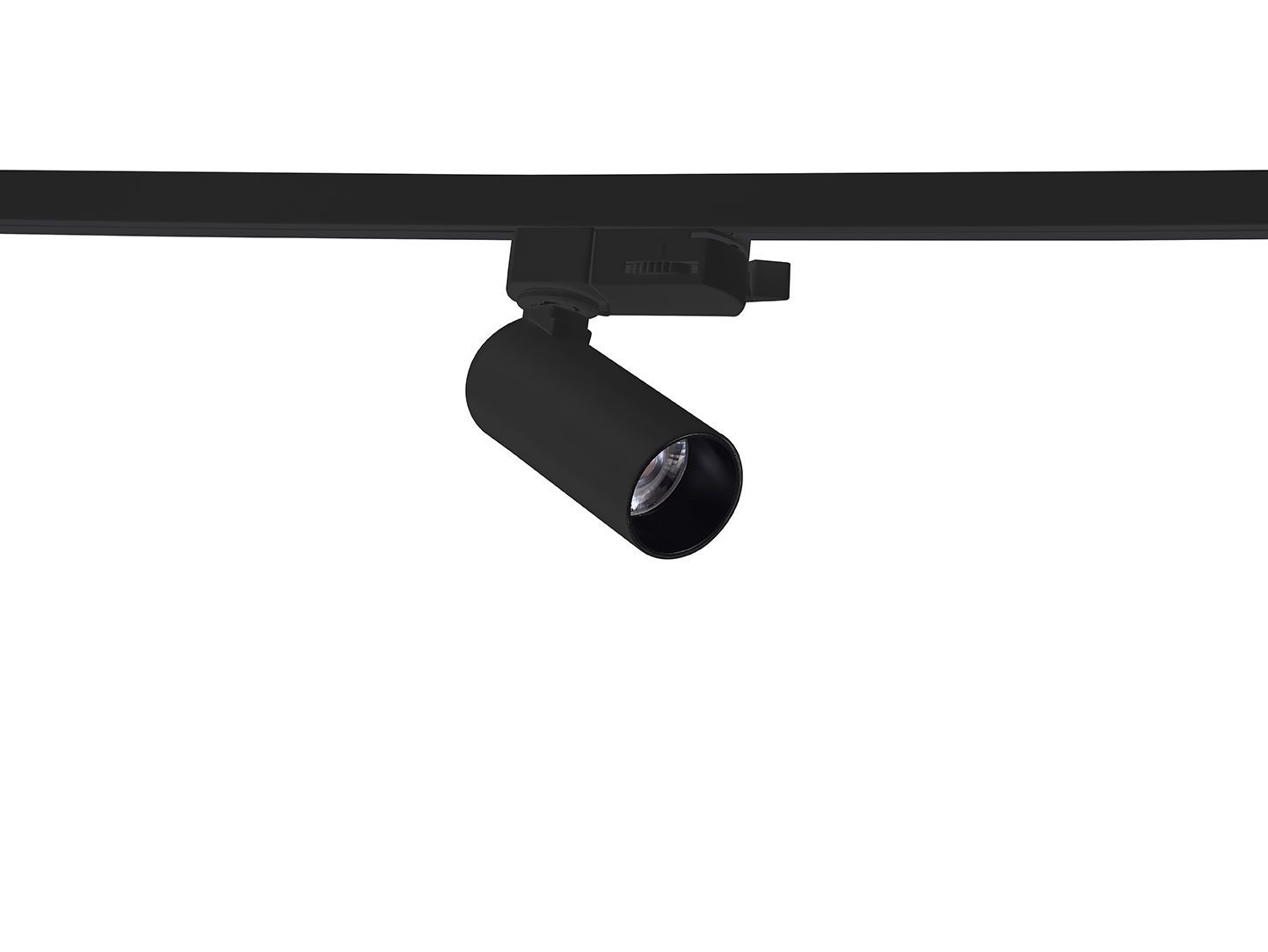 Proyector orientable para riel, construido en aluminio inyectado, terminación negro y aro antideslumbrante negro, con LED driver integrado.